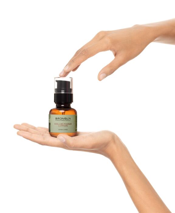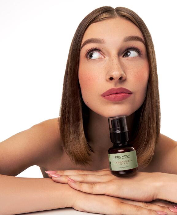 01Once the tinting mixture is fully removed, apply a small amount of the color fixing lotion to the dry eyebrows.
