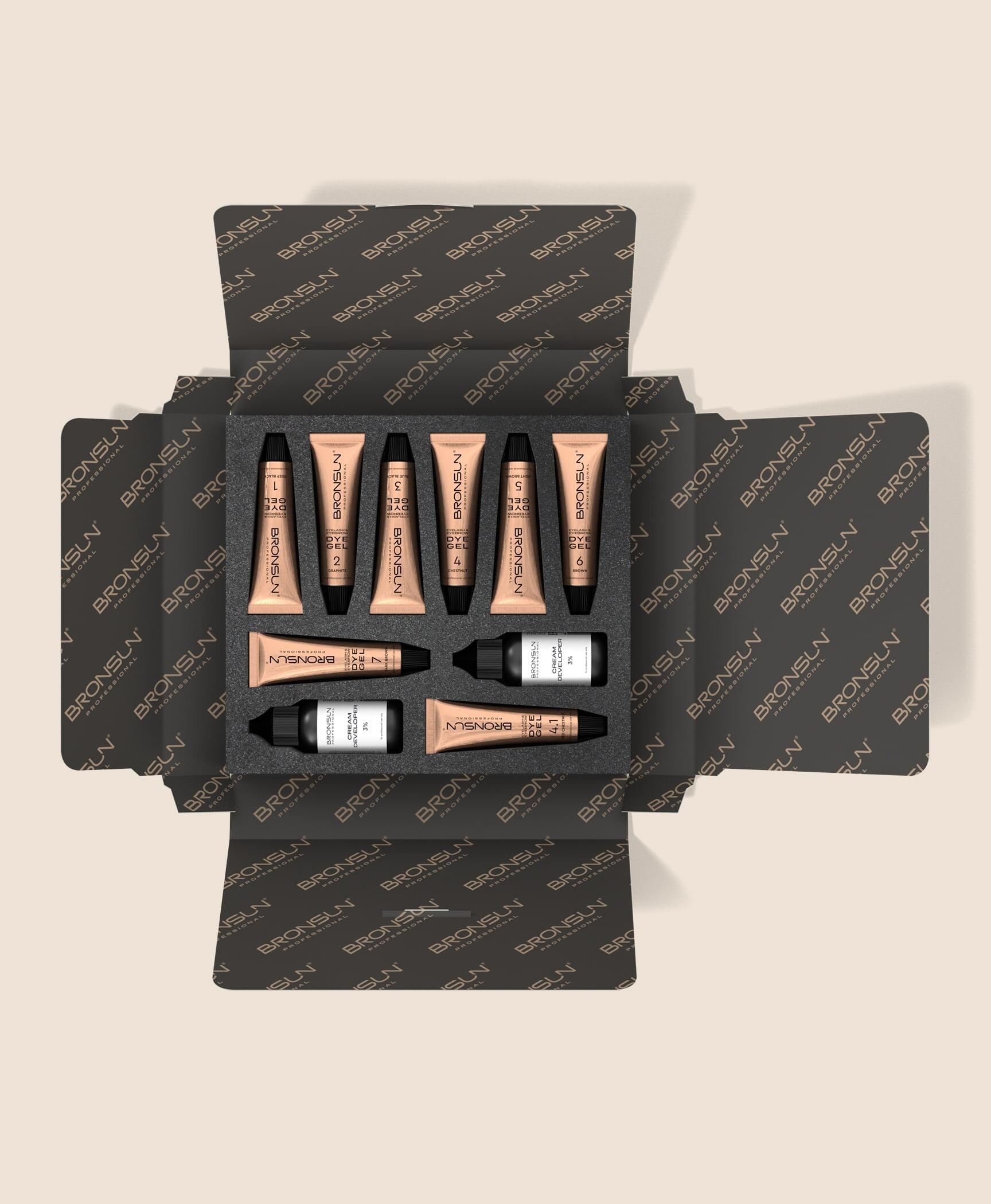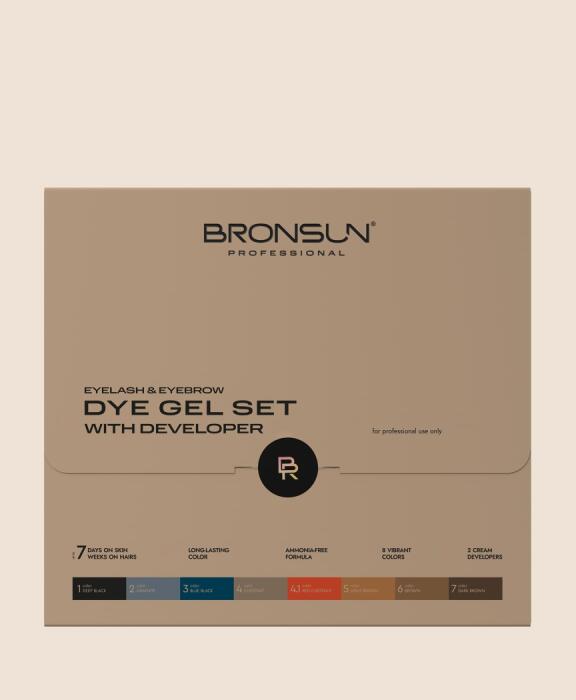 The set features all 8 gel dye BRONSUN shades along with 2 cream developers 3%. Every color can be applied as-is or combined with others to create unique mixes and perfectly tailored results.