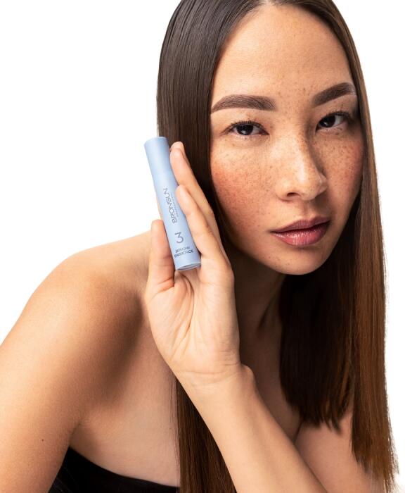 11Apply Composition #3 BROW ESSENCE BRONSUN to the dry eyebrows with the spoolie, creating the desired shape. Do not rinse.